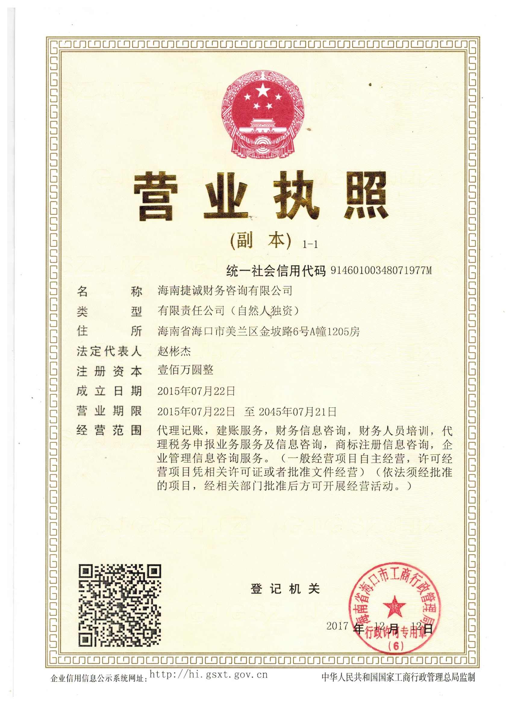 海南捷诚财务咨询有限公司(Hainan Jiecheng Finance Consultation Co., Ltd.)是经海口市工商局批准成立的一家专业财务咨询服务公司,公司拥有先进的管理模式,优秀的管理人才和专业的会计队伍,主要提供公司注册、公司变更、公司注销,建账服务,代理记账(含内账、外帐,可上门服务),代理税务申报,公司财务审计,资产清算评估,财务信息咨询,信息咨询,商标注册信息咨询,企业管理信息咨询,代办食品经营许可证、代办建筑资质等多项服务,多年来,公司与工商、税务、银行,社保等机构建立了广泛的联系,是放的心、信得过的会计服务企业。本公司全体员工将以“客户至上,用心服务”的服务理念,致力为客户提供快捷、专业、敬业、高效、诚信的服务精神,从企业的实际出发,及时准确的为企业经营决策提供税收政策、工商政策等最新信息及涉税服务,欢迎各企业领导莅临公司考察交流。 您身边的财务专家——海南捷诚财务咨询有限公司