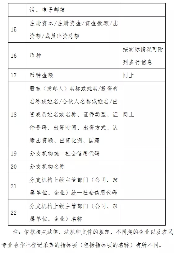 (一)明确数据项采集和交换范围。企业登记机关和税务机关对各自业务信息系统的数据项进行全面梳理,建立起数据项的对应关系。按工商企注字〔2015〕121号文件要求,企业登记机关将企业设立、变更(备案)、注销登记的相关信息(数据项见附表)及时共享到省(自治区、直辖市、计划单列市,下同)级共享交换平台;税务机关按要求将清税信息、税务机关名称及生产经营地、财务负责人、核算方式的变更信息及时共享到省级交换平台。企业登记机关对设立登记、变更登记及注销登记企业分别加注标识。对于未办理税务登记证、仅换发新营业执照的,企业登记机关将前述企业相关信息及时共享到省级共享交换平台(不含财务负责人等税务机关发起变更的数据项)。地方企业登记机关和税务机关可以根据实际情况扩大共享范围。