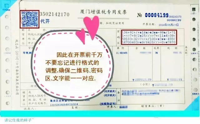 导致二维码或者密码区与文字重叠、不清楚的情况,使所开发票无法进行正常的发票认证。国税人员提醒:《发票管理办法》规定,打印发票字迹要清楚,不得压线错格,要确保打印格式精准,不得将二维码或密码区与表样原有内容重叠,否则将影响发票的使用,产生无效票。那么,正确的格式是什么样子呢?请往下看~