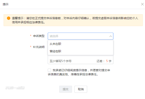勾选“我承诺已仔细阅读提示信息,并愿意对提交申诉信息的真实性、准确性承担法律责任。”