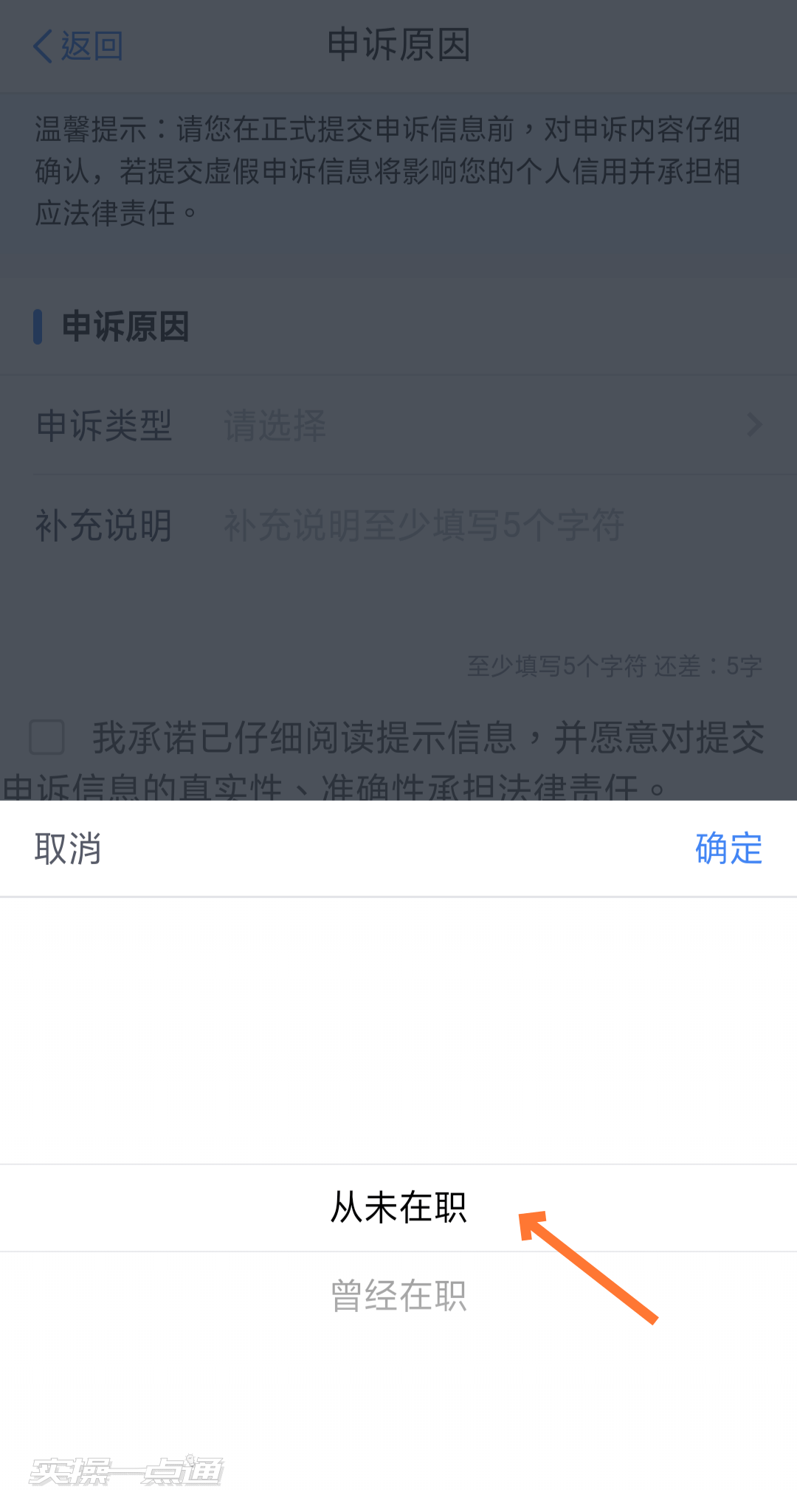 5、打开“申诉类型”页面,选择“从未任职”/“已离职”